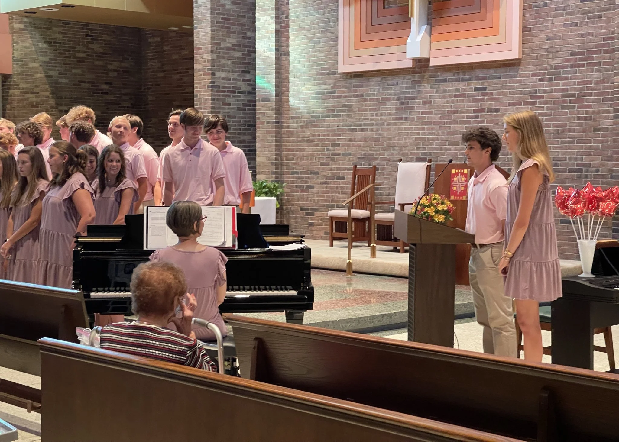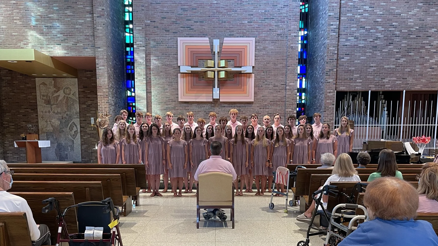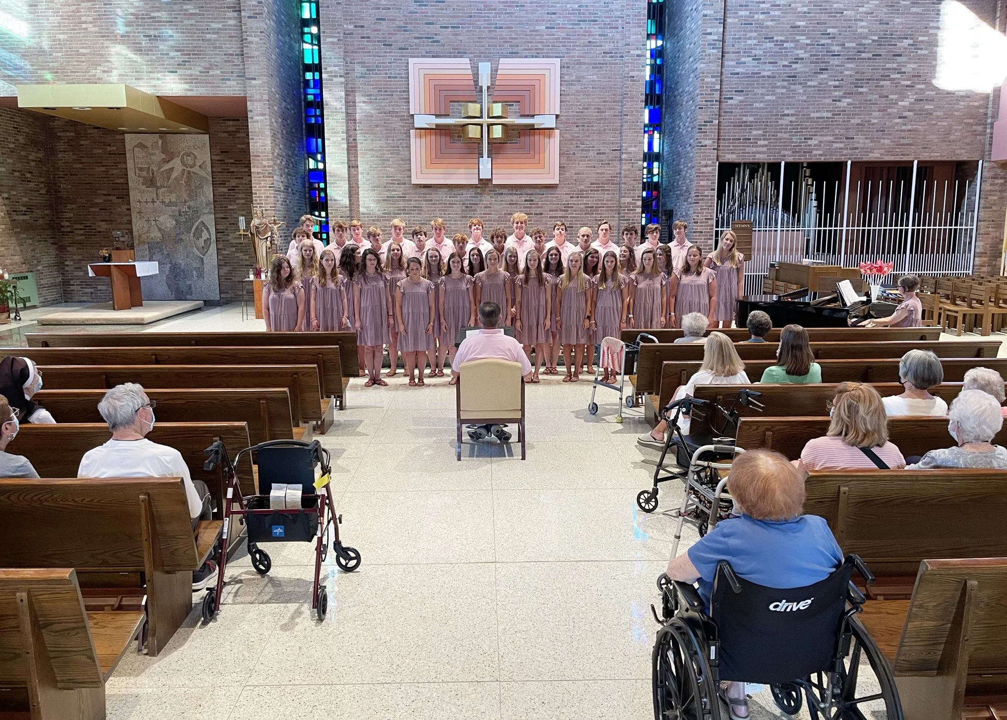 The 42-member choir is in the midst of its annual summer mission trip. While staying at Washington & Jefferson University, they are doing mission work in the mornings and performing at various locations in the evenings. The trip to Pittsburgh and performance at Mt. Assisi Place were originally scheduled for 2020 but were postponed due to the pandemic. The choir made a point of staying in touch with Karen Vevers, our activities director, and rescheduling the date this year.