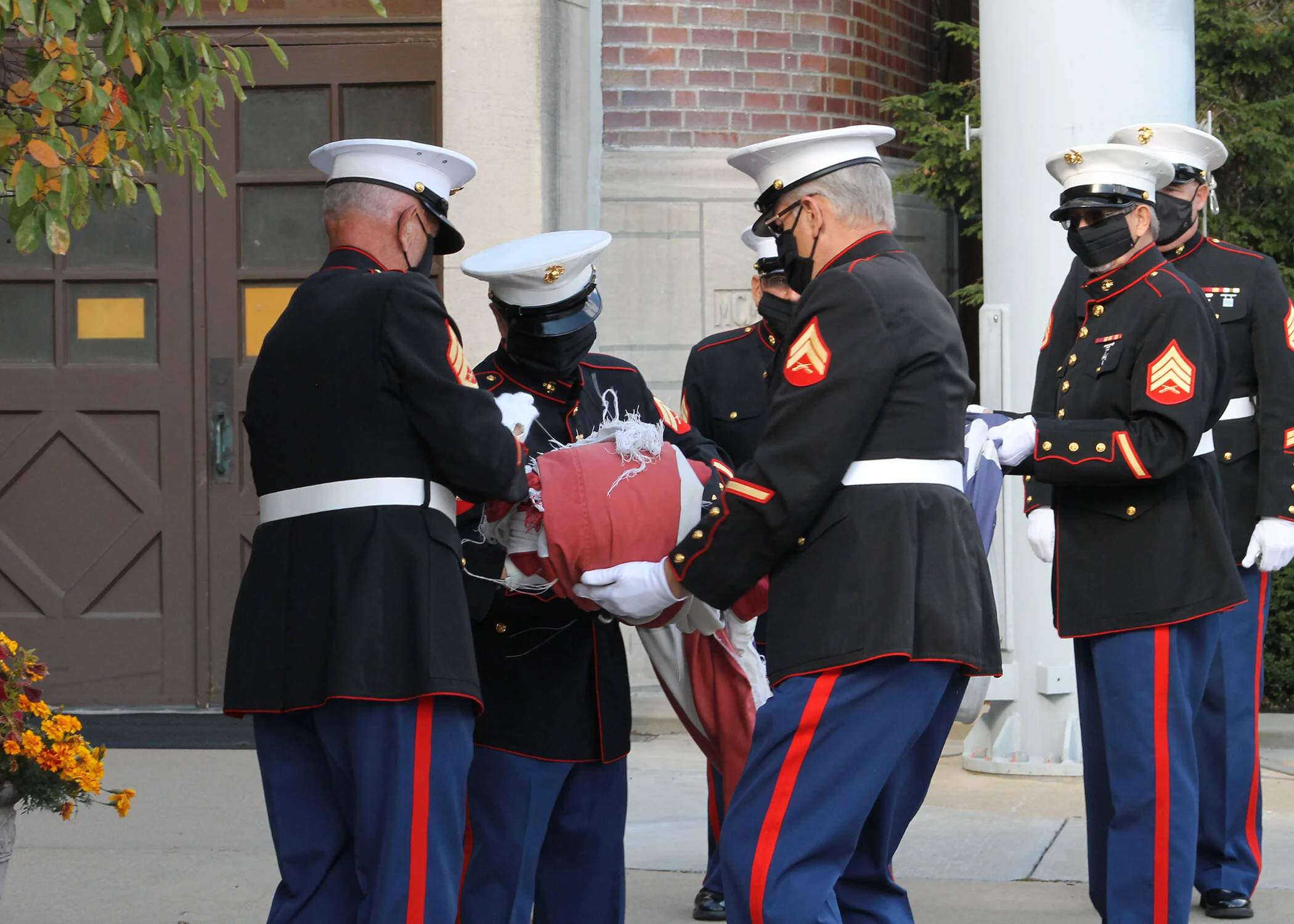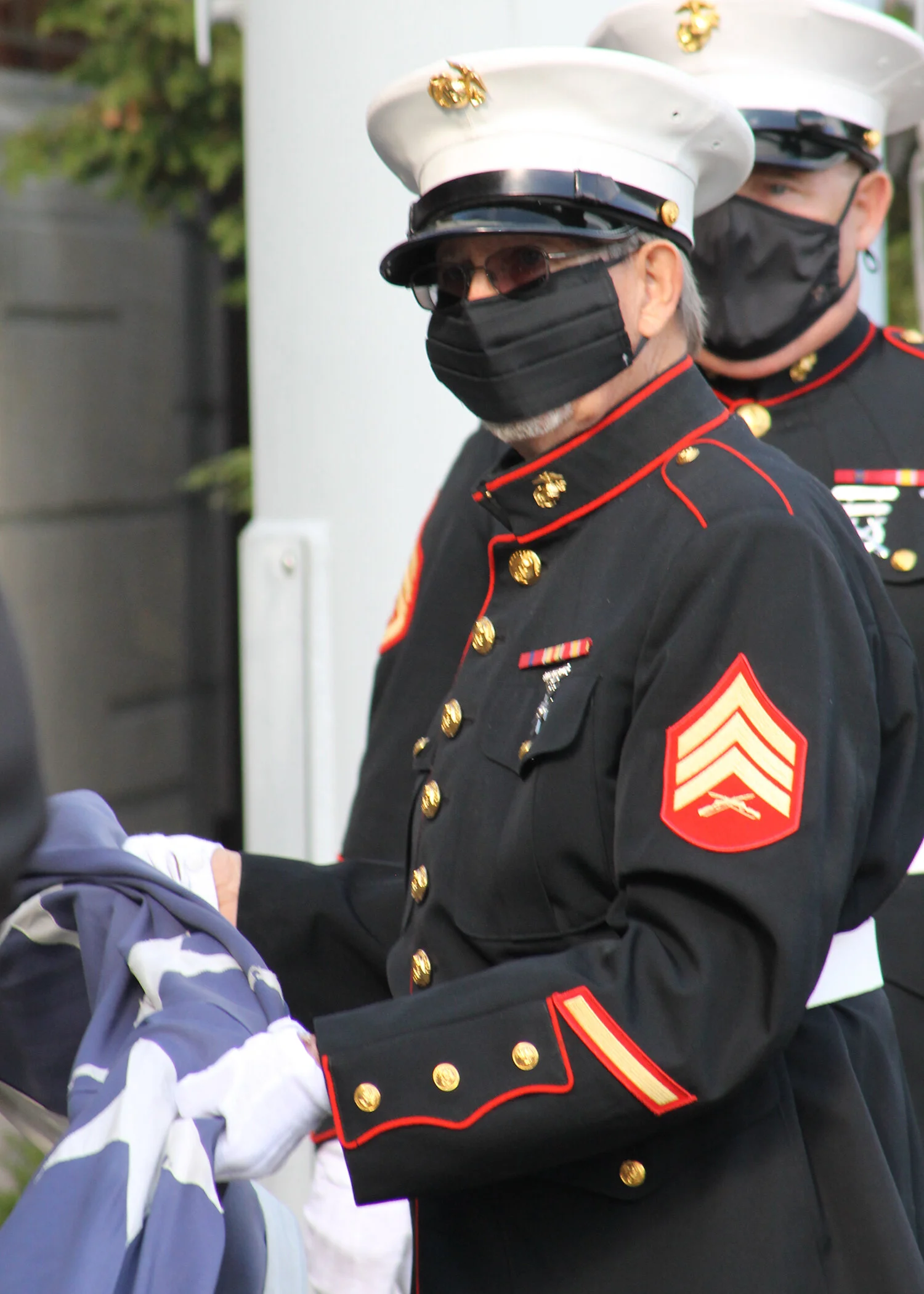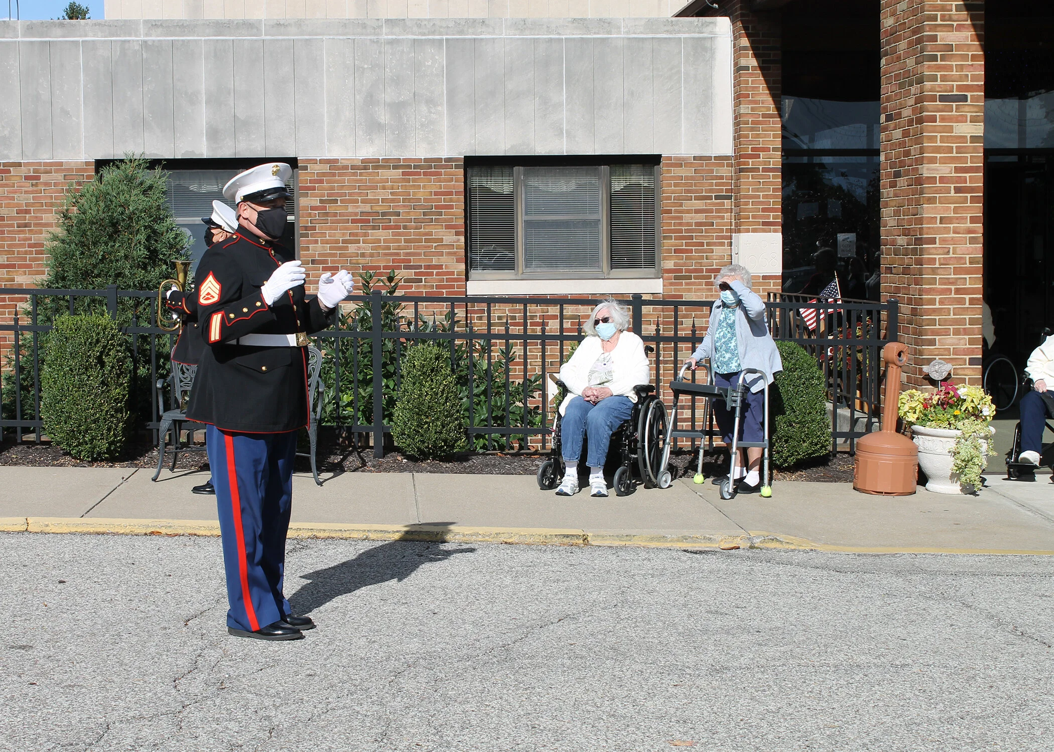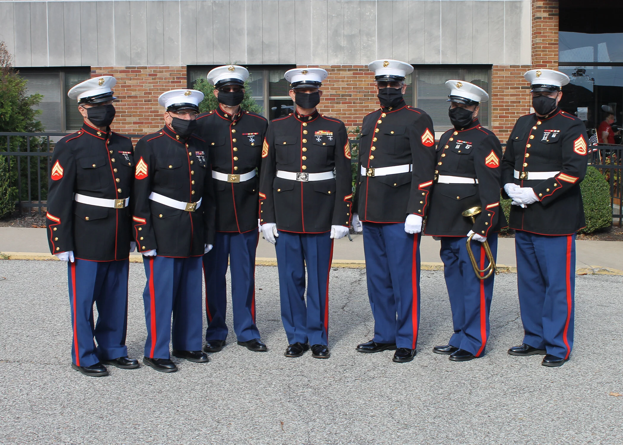 The retired Marines were all decked out in their dress uniforms, complete with face masks to keep everyone safe.