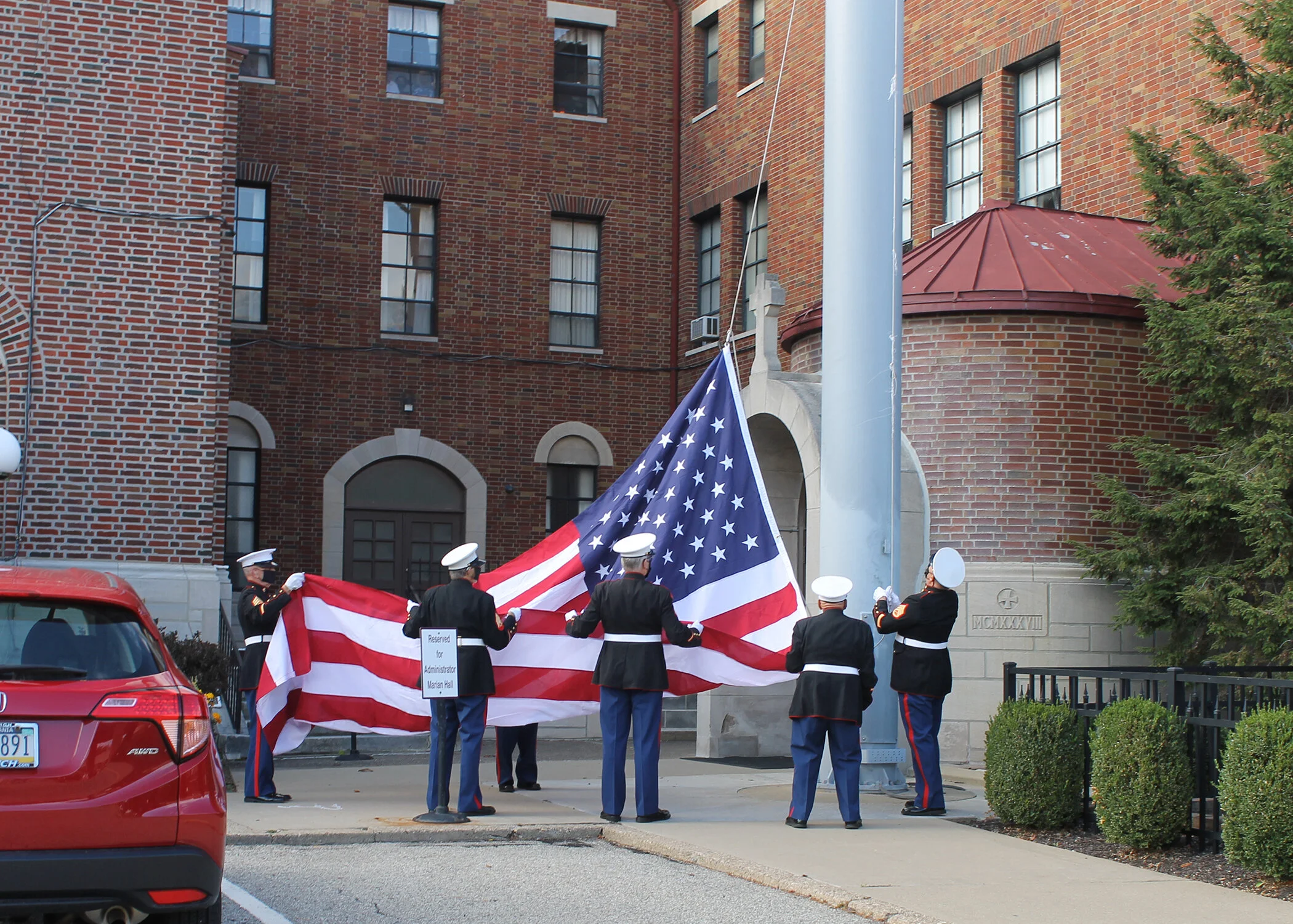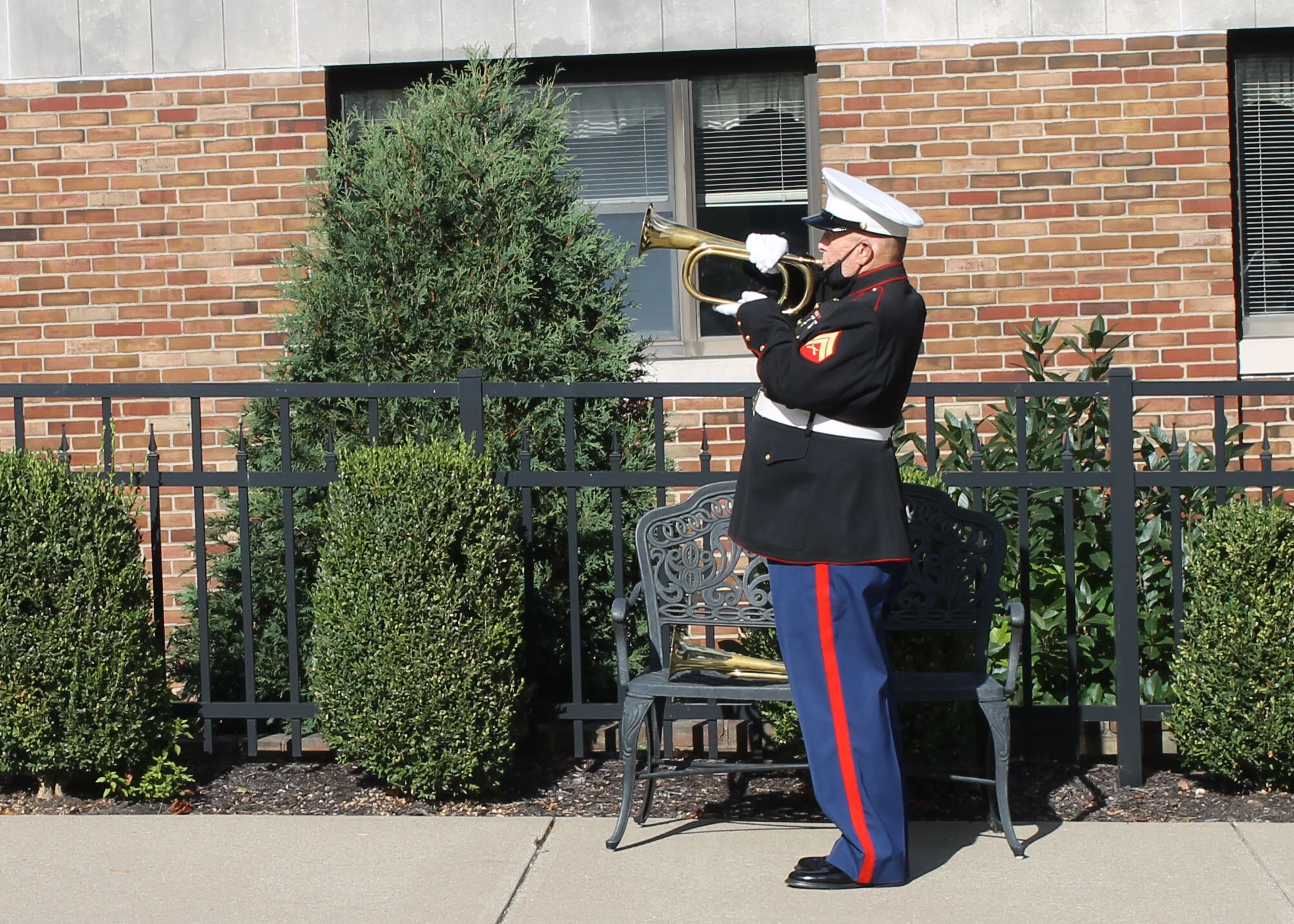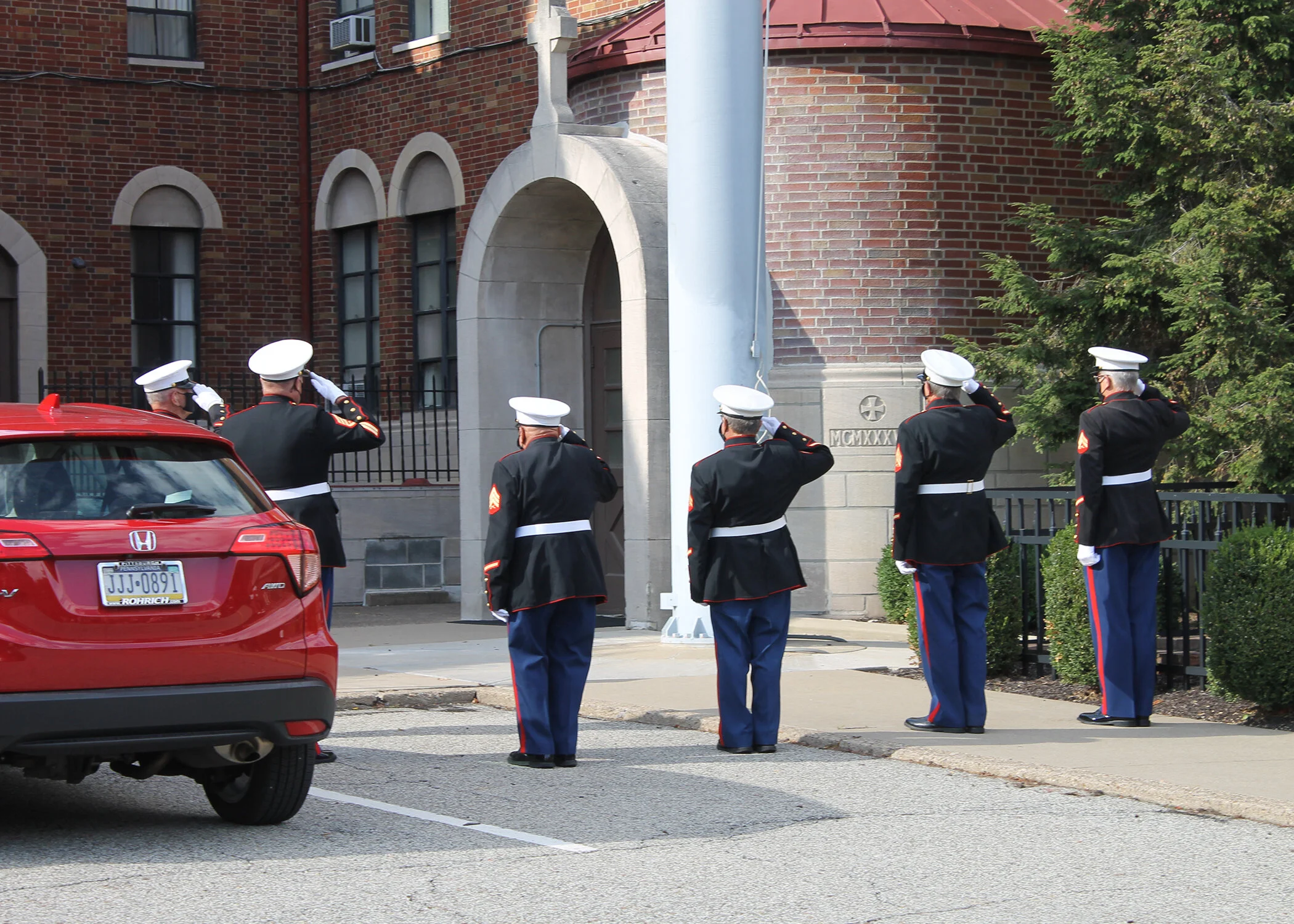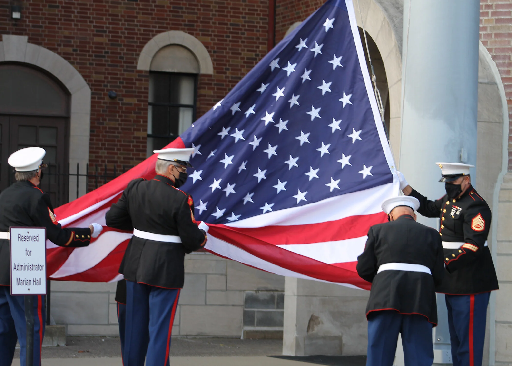 The retired Marines were all decked out in their dress uniforms, complete with face masks to keep everyone safe.